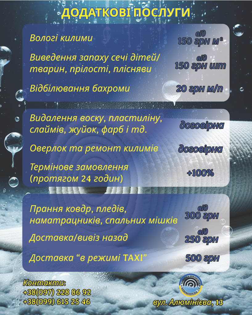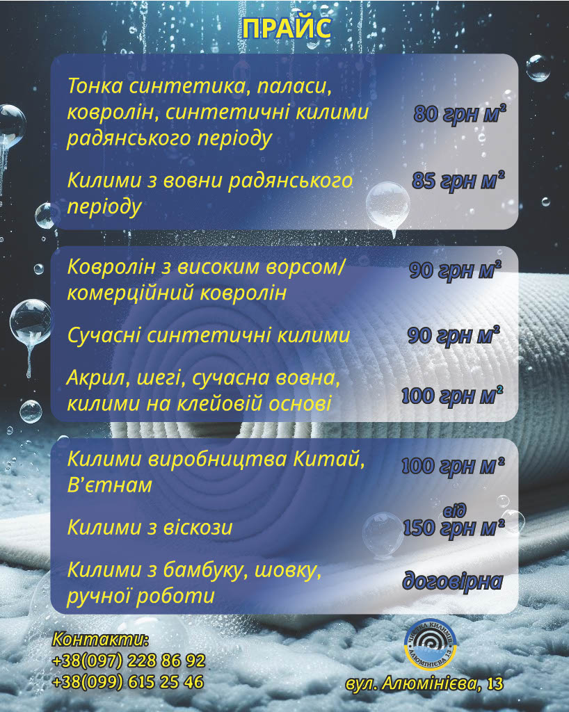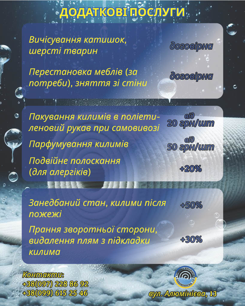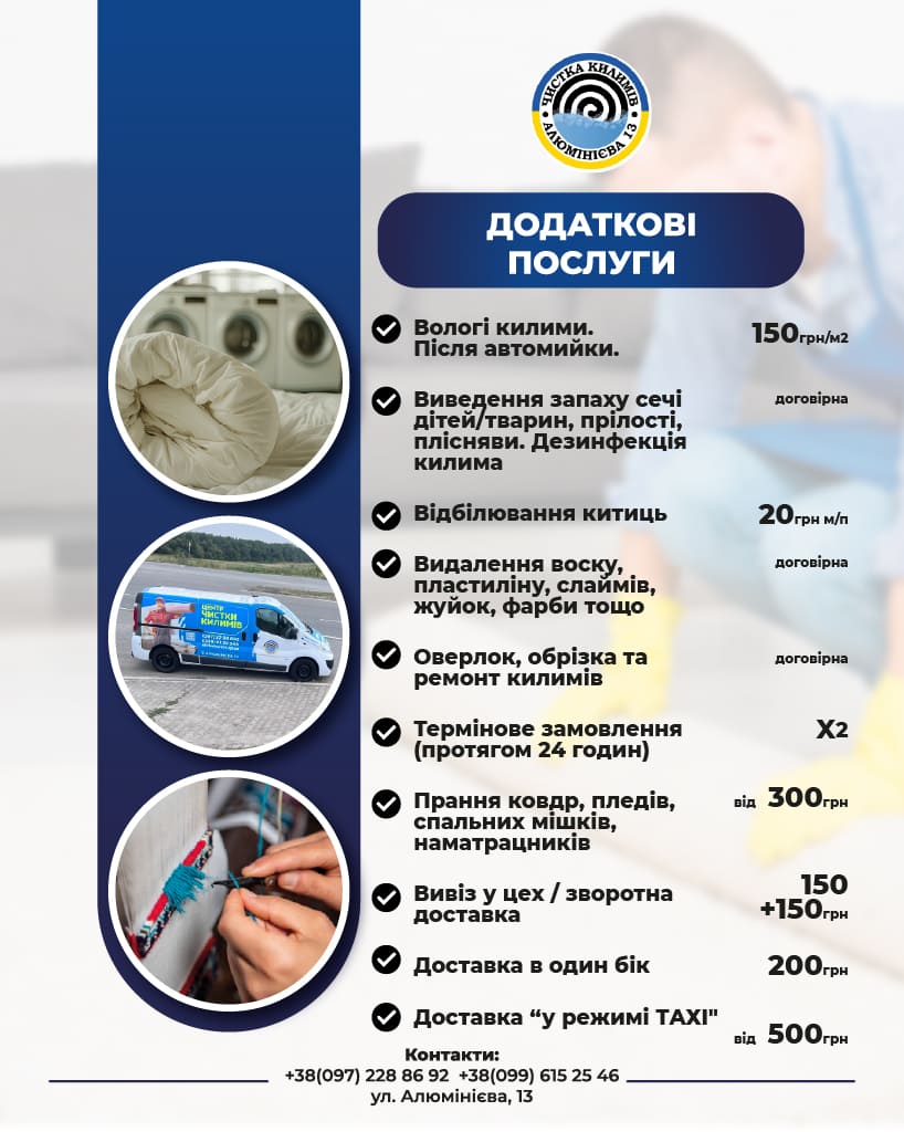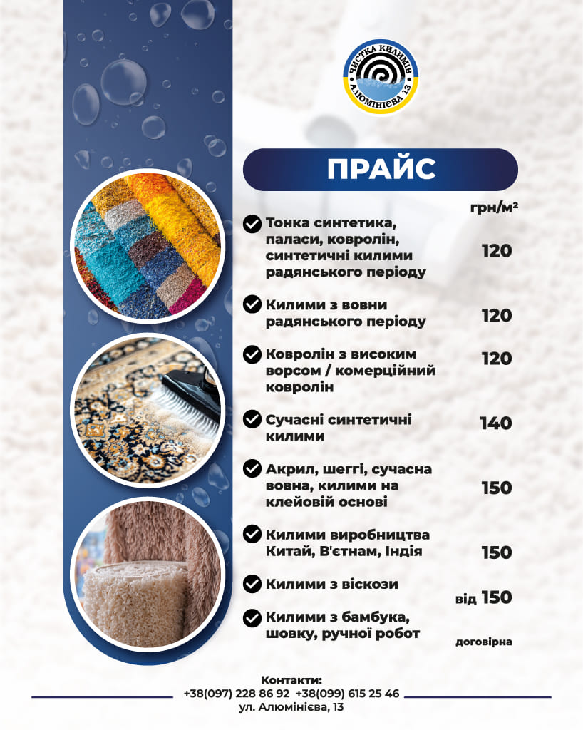 * Ціна вказана за чистку одного килима без урахування додаткових послуг та доставки (дивіться в Прайсі)